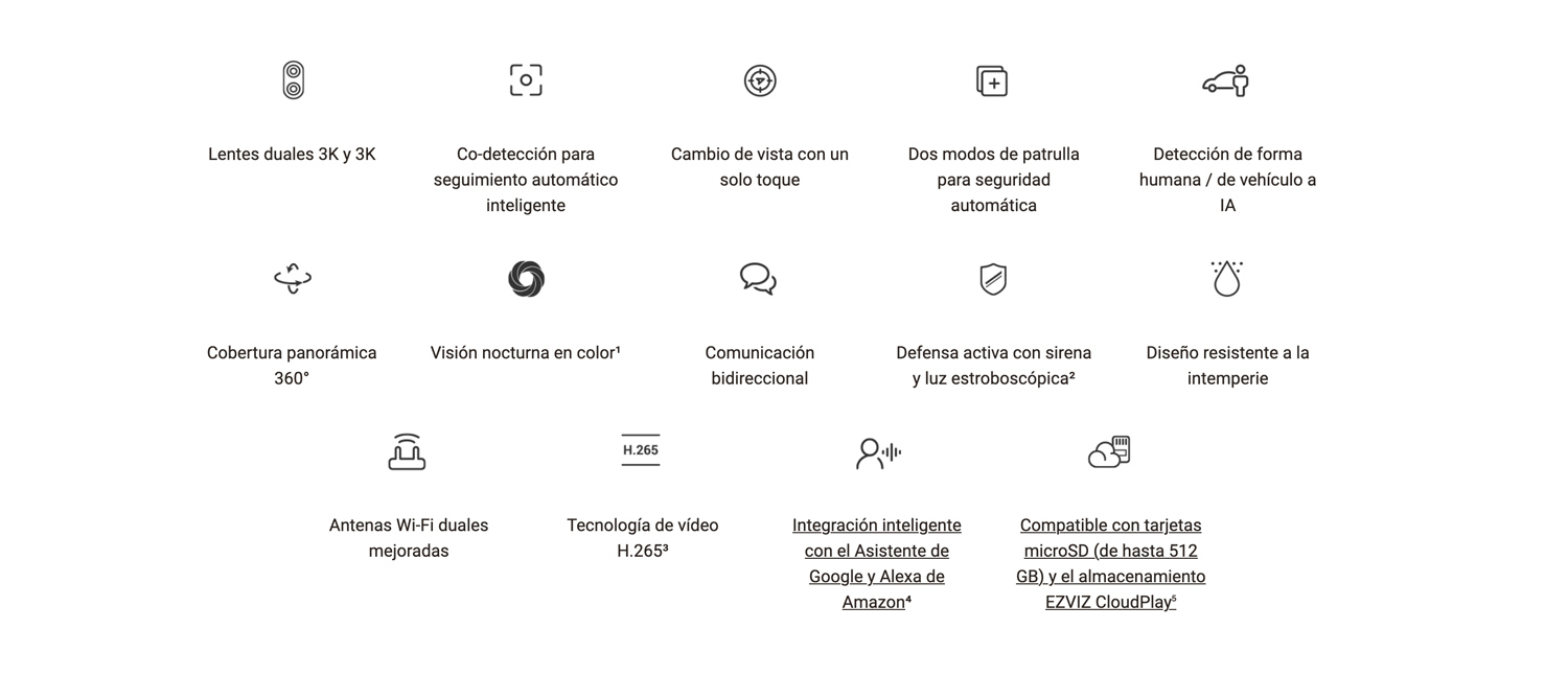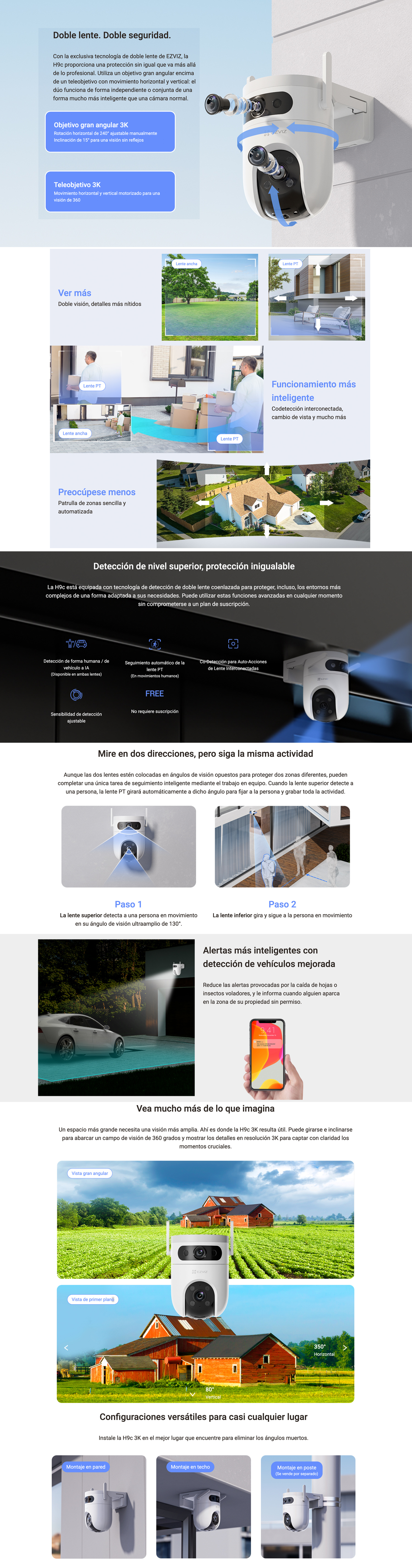 Experimente el futuro de la automatización de la seguridad con la cámara Wi-Fi inteligente de doble lente H9c 3K. Este avanzado sistema de cámaras proporciona imágenes aún más claras y detalladas que su predecesor gracias a su resolución 3K. El diseño de doble lente garantiza una cobertura integral de grandes áreas, reduciendo la necesidad de múltiples cámaras. También cuenta con funciones avanzadas como la detección de personas, de la forma del vehículo y el seguimiento inteligente basados en IA.